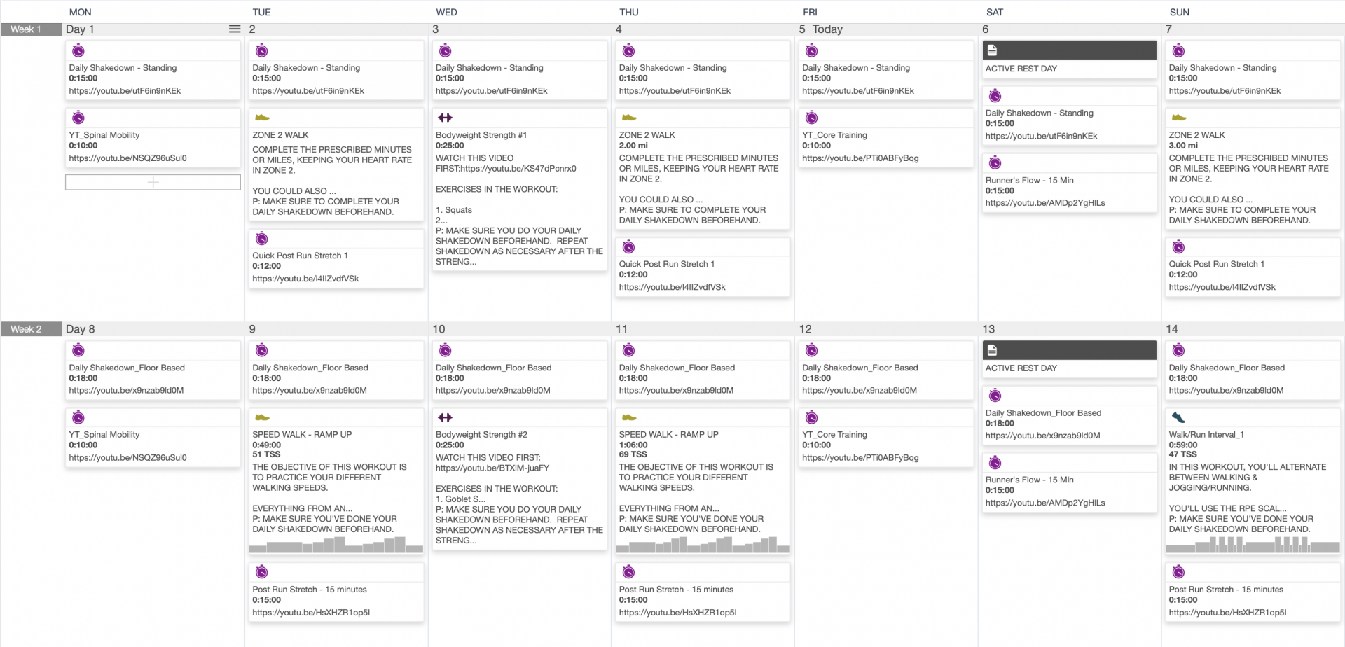 It's very simple. Once you've signed up, I'll send you an email with step-by-step instructions for how to set up your account and load the plan onto your calendar. After that, all you have to do is open the app (or the desktop version) in calendar view. You'll be able to see what workouts are on the schedule for today and the rest of the week. Click into any workout to read the description and get any special instructions.